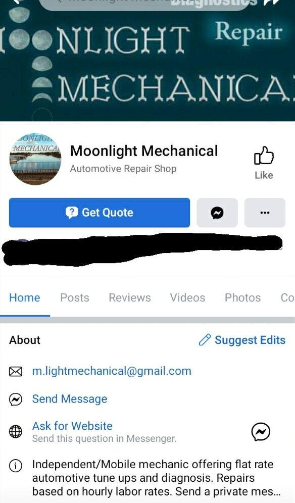 [ALT TEXT] Screenshot of a Facebook page for an auto repair business called Moonlight Mechanical. The header image says that name on a green background and the o's are moons or some shit because graphic design is my passion. To the right it says "repair" in a different glowy font. Below that it shows the standard Facebook business page header, then some redacted names of friends who had liked the page, then in the about section it shows the email address "[email protected]" Description reads "independent/mobile mechanic offering flat rate automotive tune ups and diagnosis. Repairs based on hourly labor rates. Send a private message..."