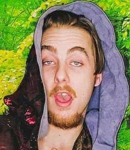 [ALT TEXT] A shot of a white person on a highly saturated green background. They are wearing a large purple hood but their dirty blonde hair is still visible. They eyebrows are very arched and they have light blue eyes. Their facial hair is slightly orange toned a d their teeth are slightly crooked (likely for getting their ass beat). They probably thought that the facial expression in this photo was an attractive one but I am here to tell you its not.