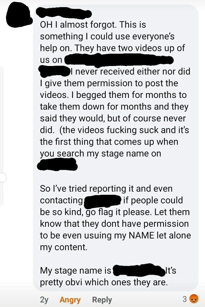 [ALT TEXT] Screenshot of a facebook post reading "OH I almost forgot. This is something I could use everyone's help on. They have two videos up of us on [redacted]. I never received either nor did I give them permission to post the videos. I begged them for months to take them down for months and they said they would, but of course never did. (The videos fucking suck and it's the first thing that comes up when you search my stage name on [redacted].