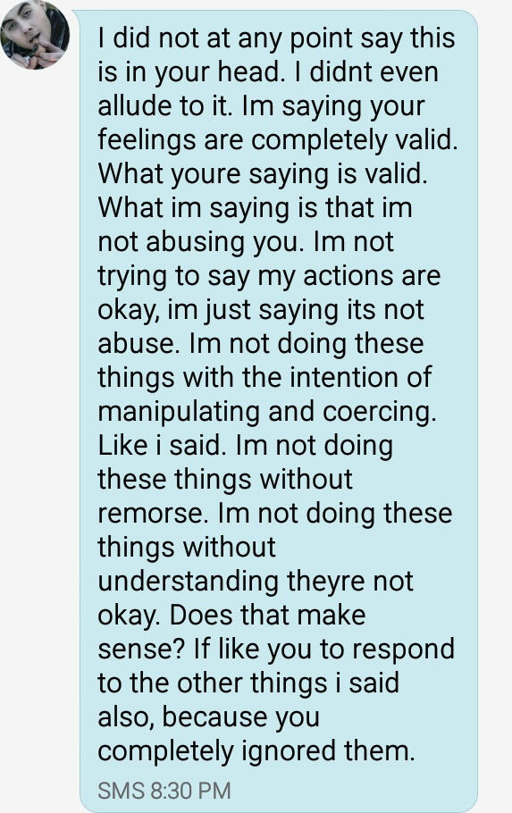 [ALT TEXT] Screenshot of a text message from Arowyn. It reads: "I did not at any point say this is in your head. I didnt even allude to it. I'm saying your feelings are completely valid. What you're saying is valid. What I'm saying is that I'm not abusing you. I'm not trying to say my actions are okay, I'm just saying it's not abuse. I'm not doing these things with the intention of manipulating and coercing. Like I said. I'm not doing these things without remorse. I'm not doing these things without understanding they're not okay. Does that make sense? Id like you to respond to the other things I said also, because you completely ignored them." Timestamp reads 8.30