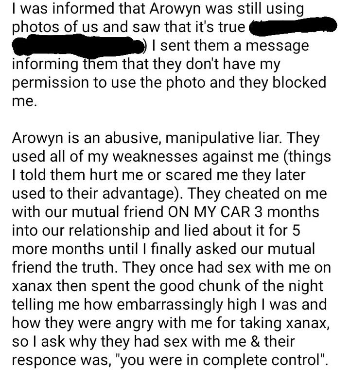 [ALT TEXT] Screenshot of a typed statement reading, "I was informed that arowyn was still using photos of us and saw that it's true [redacted text] I sent them a message informing them that they dont have permission to use the photo and they blocked me. Arowyn is an abusive, manipulative liar. They used all of my weaknesses against me (things I told them hurt me or scared me they later used to their advantage). They cheated on me with our mutual friend ON MY CAR 3 months into our relationship and lied about it for 5 more months until I finally asked our mutual friend the truth. They once had sex with me on xanax then spent the good chunk of the night telling me how embarrassingly high I was and how they were angry with me for taking xanax, so I ask why they had sex with me and their response was, 'you were in complete control.'" There is no timestamp.
