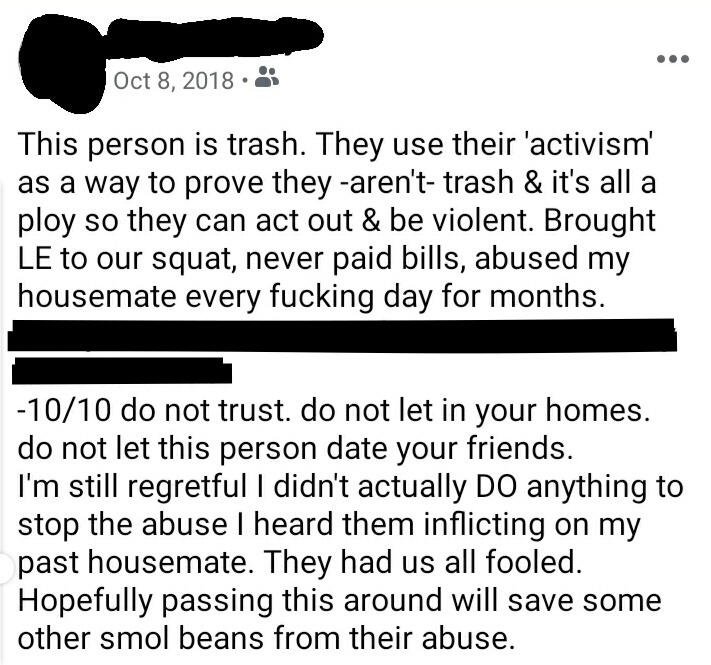 [ALT TEXT] Screenshot of a Facebook post dated Oct 8, 2018 reading "this person is trash. They use their 'activism'as a way to prove they -aren't- trash & it's all a ploy so they can act out and be violent. Brought LE to our squat, never paid Bill's, abused my housemate every fucking day for months. [redacted] -10/10 do not trust. Do not let in your homes. Do not let this person date your friends. I'm still regretful I didnt actually DO anything to stop the abuse I heard them inflicting on my past housemate. They had us all fooled. Hopefully passing this around will save some other smol beans from their abuse."