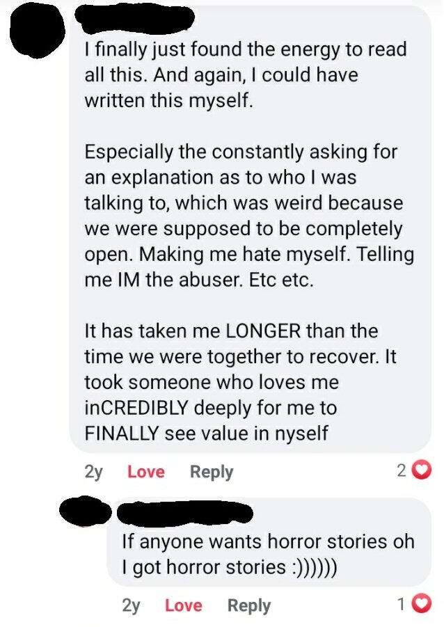 [ALT TEXT] Screenshot of a Facebook post from a redacted username reading "I finally just found the energy to read all this. And again, I could have written this myself. Especially the constantly asking for an explanation as to who I was talking to, which was weird because we were supposed to be completely open. Making me hate myself. Telling me I'M the abuser. Etc etc. It has taken me LONGER than the time we were together to recover. It took someone who loves me INCREDIBLY deeply for me to FINALLY see value in myself." First reply says "if anyone wants horror stories oh I got horror stories" followed by a smiley face made with several parenthesis.