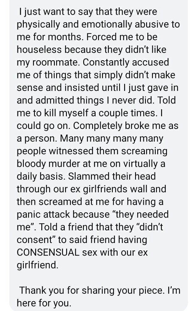 [ALT TEXT] Screenshot of a statement saying "I just want to say that they were physically and emotionally abusive to me for months. Forced me to be houseless because they didnt like my roommate. Constantly accused me of things that simply didnt make sense and insisted until I just gave in and admitted things I never did. Told me to kill myself a couple times.i could go on. Completely broke me as a person. Many many many many people witnessed them screaming bloody murder at me on virtually a daily basis. Slammed their head through our ex girlfriend's wall and then screamed at me for having a panic attack because "they needed me." Told a friend that they "didnt consent" to said friend having CONSENSUAL sex with our ex girlfriend. Thank you for sharing your piece. I'm here for you."