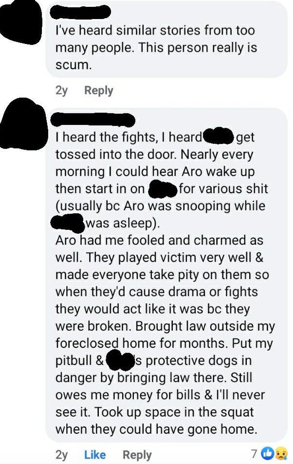 [ALT TEXT] Screenshot of a Facebook convo dated 2 years back; user names are redacted. First post reads "I've heard similar stories from too many people. This person really is scum." Second comment reads "I heard the fights, I heard [redacted] get tossed into the door. Nearly every morning I could hear Aro wake up then start in on [redacted] for various shit (usually because aro was snooping while [redacted] was asleep). Aro had me fooled and charmed as well. They played victim very well and made everyone take pity on them so when they'd cause drama or fights they would act like it was bc they were broken. Brought law outside my foreclosed home for months. Put my pitbull & [redacted]'s protective dogs in danger by bringing law there. Still owes me money for bills and I'll never see it. Took up space in the squat when they could have gone home." There are 7 reactions. The timestamp says 2y.
