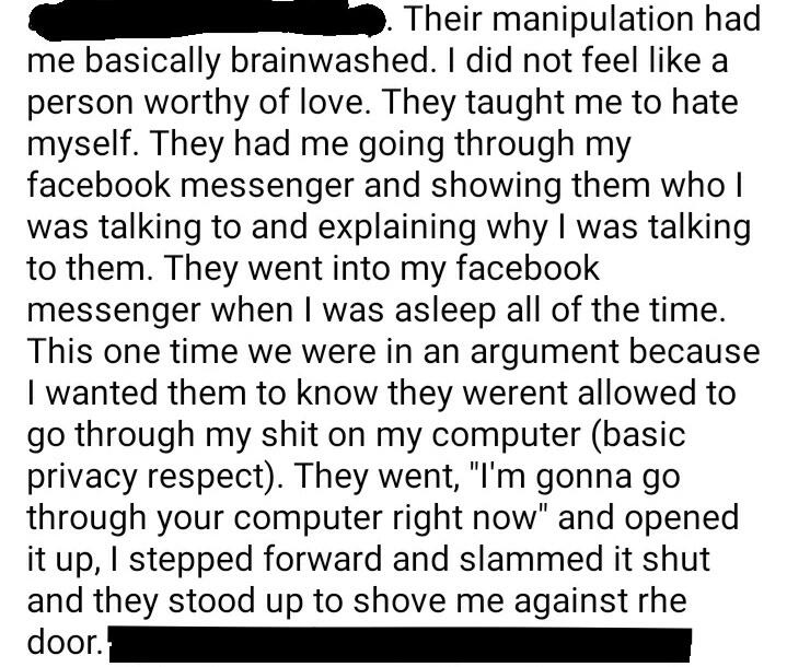 [ALT TEXT] Screenshot of a statement beginning with a short redacted text. The remainder reads, "Their manipulation had me basically brainwashed. I did not feel like a person worthy of love. They taught me to hate myself. They had me going through my Facebook messenger and showing them who I was talking to and explaining why I was talking to them. They went into my Facebook messenger when I was asleep all of the time. This one time we were in an argument because I wanted them to know they weren't allowed to go through my shit on my computer (basic privacy respect). They went, " I'm gonna go through your computer right now"and opened it up, I stepped forward and slammed it shut and they stood up to shove me against the door." There is no timestamp.