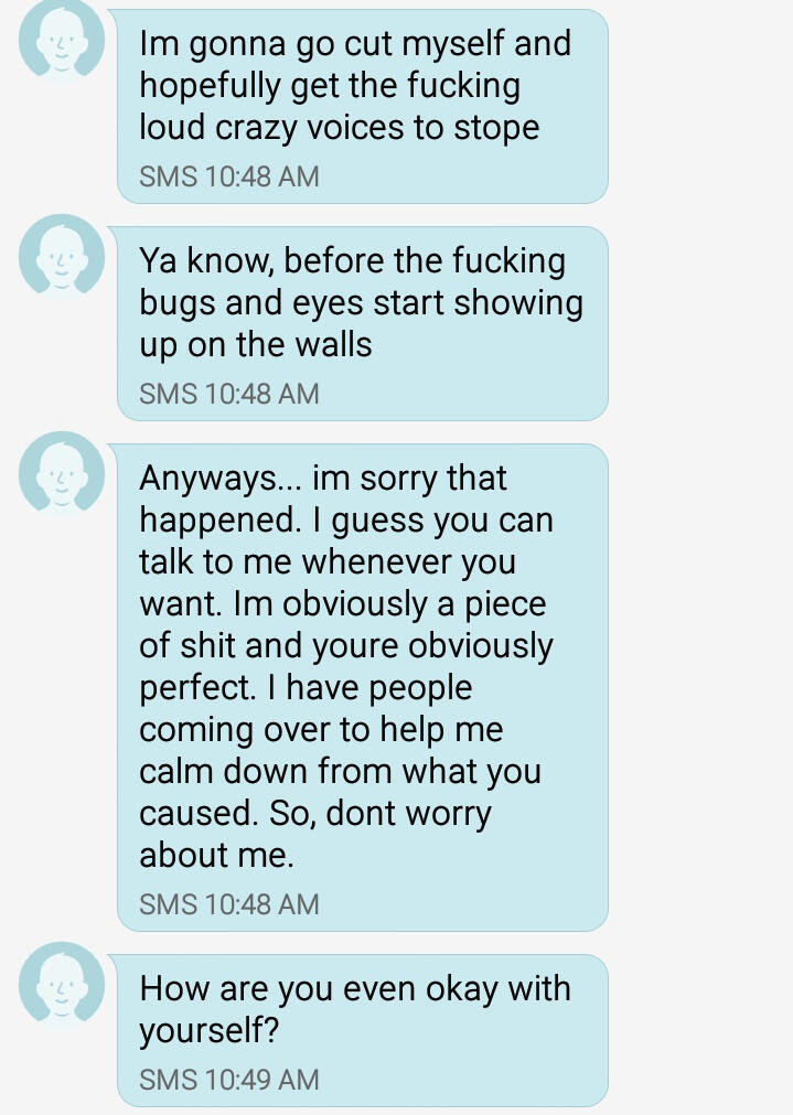 [ALT TEXT] Screenshot of a text conversation. The person who is taking the screenshot has not sent any messages. Messages from sender (sent at 10.48) read "I'm gonna go cut myself and hopefully get the fucking loud crazy voices to stop" separate text at 10:48 ""yaknow, before the fucking bugs and eyes start showing up on the walls" separate text at 10:48 ""anyways... I'm sorry that happened. I guess you can talk to me whenever you want. I'm obviously a piece of shit and you're obviously perfect. I have people coming over to help me calm down from what you caused. So, dont worry about me" separate text at 10:49 "how are you even okay with yourself?"