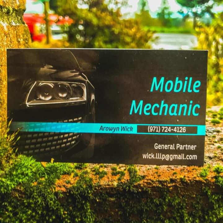 [ALT TEXT] A business card sitting on an oversaturated (mostly green) background. The card is black with blue tints and a car is pictured on the left. Text reads "Mobile Mechanic, Arowyn Wick, 971 724 4126, general partner, [email protected]"