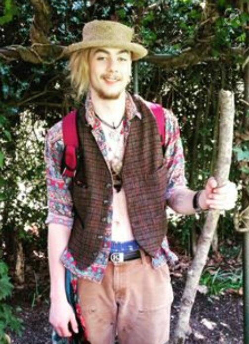 [ALT TEXT] A photo of a white person in a straw hat. They have blonde hair and dark bushy eyebrows. They have light brown facial hair. They are wearing a mostly red patterned shirt with a brown vest overtop. They have several necklaces with stones on them. They are wearing brown carhartt pants and holding a large stick like a cane or staff or whatever.