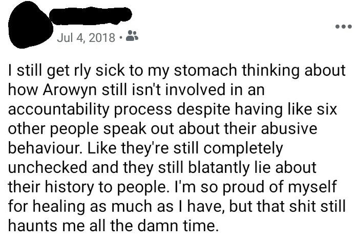 [ALT TEXT] Screenshot of a Facebook post dated July 4, 2018. The posters name is blurred out. The post reads, "I still get rly sick to my stomach thinking about how arowyn still isn't involved in an accountability process despite having like six other people speak out about their abusive behavior. Like they're still completely unchecked and they still blatantly lie about their history to people. I'm so proud of myself for healing as much as I have, but that shit still haunts me all the damn time.