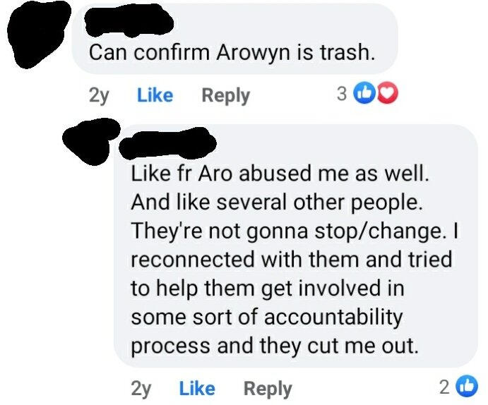 [ALT TEXT] Screenshot of a Facebook conversation between two users with both names blurred from 2 years prior to time of screenshot. First post reads "Can confirm Arowyn is trash." The reply reads "Like fr Aro abused me as well. And like several other people. theyre not gonna stop/change. I reconnected with them and tried to help them get involved in some sort of accountability process and they cut me out." The like button is highlighted on both comments.