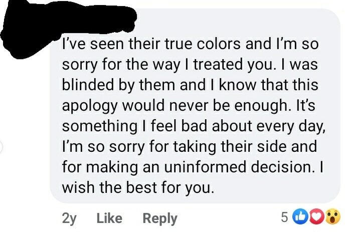 [ALT TEXT] Screenshot of a facebook post from a blurred out username reading, "I've seen their true colors and I'm so sorry for the way I treated you. I was blinded by them and I know that this apology would never be enough. It's something I feel bad about every day, im so sorry for taking their side and for making an uninformed decision. I wish the best for you." The exact date is not shown but the timestamp says 2y.
