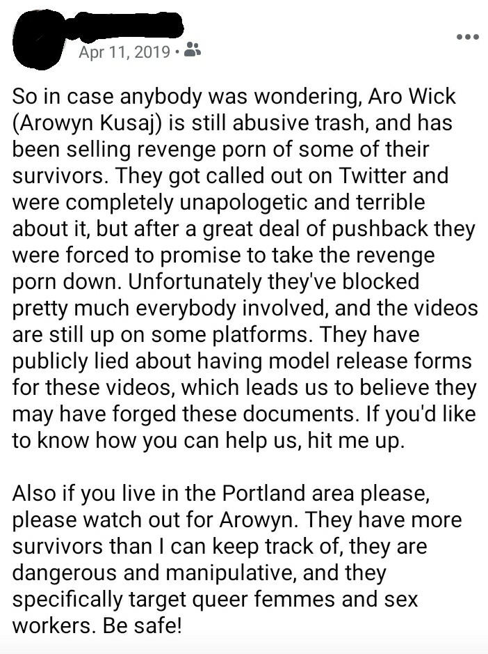 [ALT TEXT] Screenshot of a FB post dated April 11, 2019, reading "So in case anybody was wondering, Aro Wick (Arowyn Kusaj) is still abusive trash, and has been selling revenge porn of some of their survivors. They got called out on twitter and were completely unapologetic and terrible about it, but after a great deal of pushback they were forced to promise to take the revenge porn down. Unfortunately they've blocked pretty much everybody involved, and the videos are still up on some platforms. They have publicly lied about having model release forms for these videos, which leads us to believe they may have forged these documents. If you'd like to know how you can help us, hit me up.